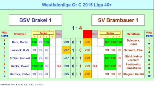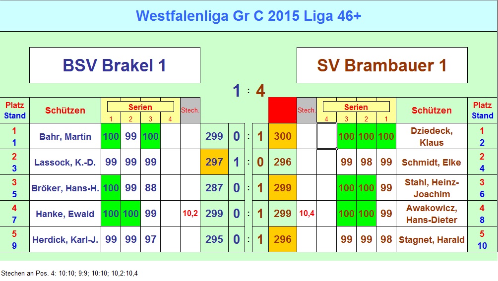 Jetzt standen die verbliebenen drei Schützen unserer Mannschaft mit dem Rücken zur Wand. Kein Punkt durfte mehr verlorengehen um nicht als Verlierer vom eigenen Stand zu gehen. Spannung pur. Leider platzten die Träume von einem Heimsieg ziemlich schnell. Vorher brachte jedoch Klaus-Dieter Lassock in seiner gewohnt schnellen Art seinen Punkt nach Hause. Allerdings traf er auf eine Gegnerin, die ihre 30 Schuss noch schneller versenkte als der ebenfalls flotte Klaus-Dieter. In knapp über acht Minuten schoss Elke Schmidt von Brambauer ihre 296 Ringe. Nur zwei Minuten langsamer war Klaus-Dieter für seine 297 Ring. Somit stand es nur noch 1:2. An Position eins traf der in Serie 300 schießende Martin Bahr auf Klaus Dziedeck von Brambauer. In Serie zwei zollte Martin dem für ihn ungewohnten Schießformat und der damit verbundenen Nervosität Tribut und eine 9,9. Am Ende standen immer noch herausragende 299 Ringe auf dem Bildschirm. Gegner Klaus Dziedeck zeigte Nervenstärke und beendete seinen Wettkampf mit der einzigen 300 des Tages. Das war der dritte Punkt für Brambauer und damit der Sieg für den Gegner. Das Ergebnis der Paarung H.-H. Bröker - Stahl konnte das Blatt also nicht mehr wenden. Nach einem Fehlschuss von Hans-Hermann war auch hier die Entscheidung früh gefallen.