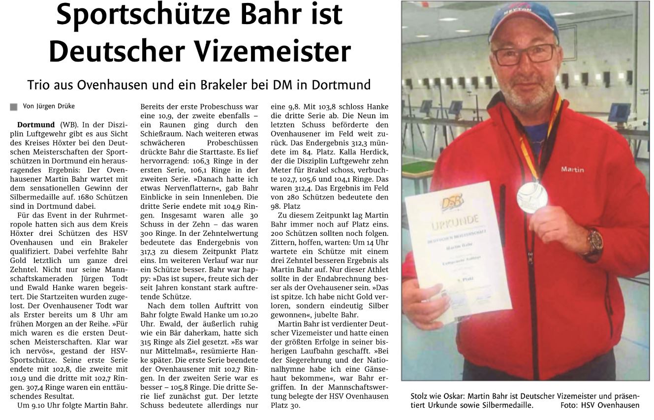 03.11.2018 Martin Bahr, Mitglied unserer Westfalenliga-Mannschaft, hat den zweiten Platz bei den Deutschen Meisterschaften im Luftgewehr-Auflage-Schießen in Dortmund errungen. Für seinen Heimatverein, HSV Ovenhausen startend, behielt er im LLZ mal wieder, wie so oft, die Nerven und legte mit 317,3 Ringen ein Superergebnis hin. Um vier Zehntel (!!) verpasste er den Meistertitel. Herzlichen Glückwunsch Martin zu diesem tollen Erfolg.