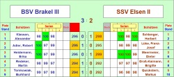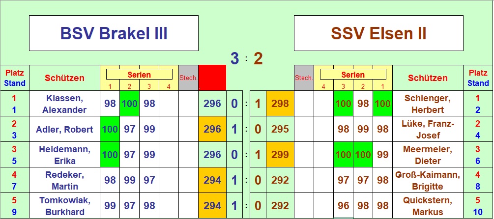 An den Positionen eins bis drei entwickelten sich von Anfang an spannende Matches. Herbert Schlenger und Dieter Meermeier gewannen dabei ihre Duelle mit starken 298 und 299 Ringen für die Hubertusschützen. An Position zwei mußte dann die Entscheidung fallen. Für Brakel stand hier Robert Adler und für Elsen Franz-Josef Lüke an der Feuerlinie. Robert beendete seinen Wettkampf vor Franz-Josef, der mit einem Ring Vorsprung noch fünf Schuss zu absolvieren hatte. Nachdem eine "Neun" den Gleichstand nach "Miesen" brachte, mußte der letzte Schuss über ein Stechen oder den Sieg für Brakel entscheiden. Der Schuss wurde ausgelöst und dann war klar, Brakel III gewinnt mit 3:2 diesen Wettkampf. Denn auf der Anzeigetafel wurde eine Neun für Franz-Josef angezeigt. [Tabelle Ligaverwaltung]